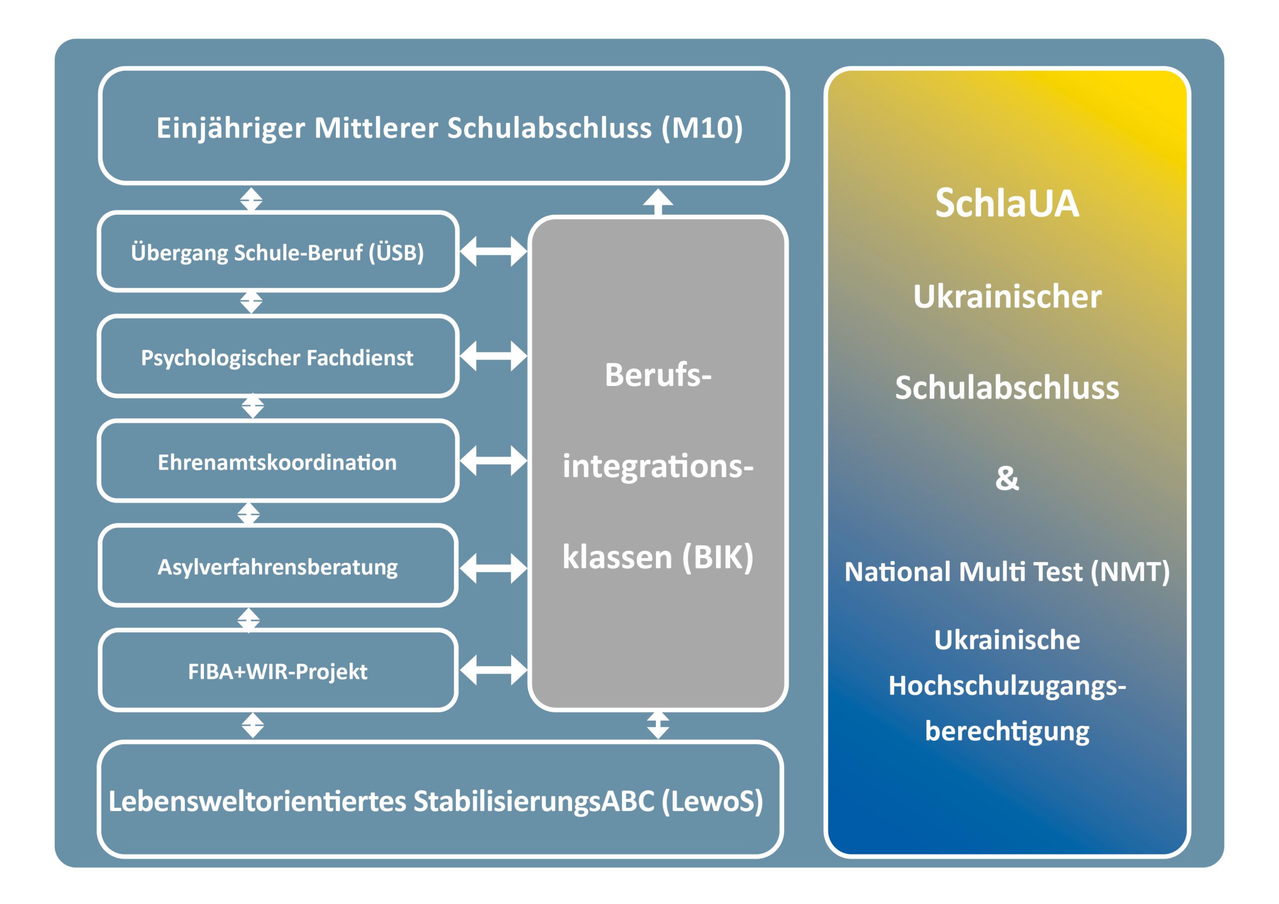 Die Angebote von SchlaU erstrecken sich über das Kompetenztraining LewoS als Vorbereitung auf die Berufsintegrationsklassen (BIK), die psychosoziale Unterstützung der BIK-Klassen in der Schertlinstraße, einer Klasse (M 10) in der der Mittlere Schulabschluss erworben wird, bis zum Nachbetreuungsprogramm (ÜSB), in dem ehemalige Schüler*innen unterstützt werden.