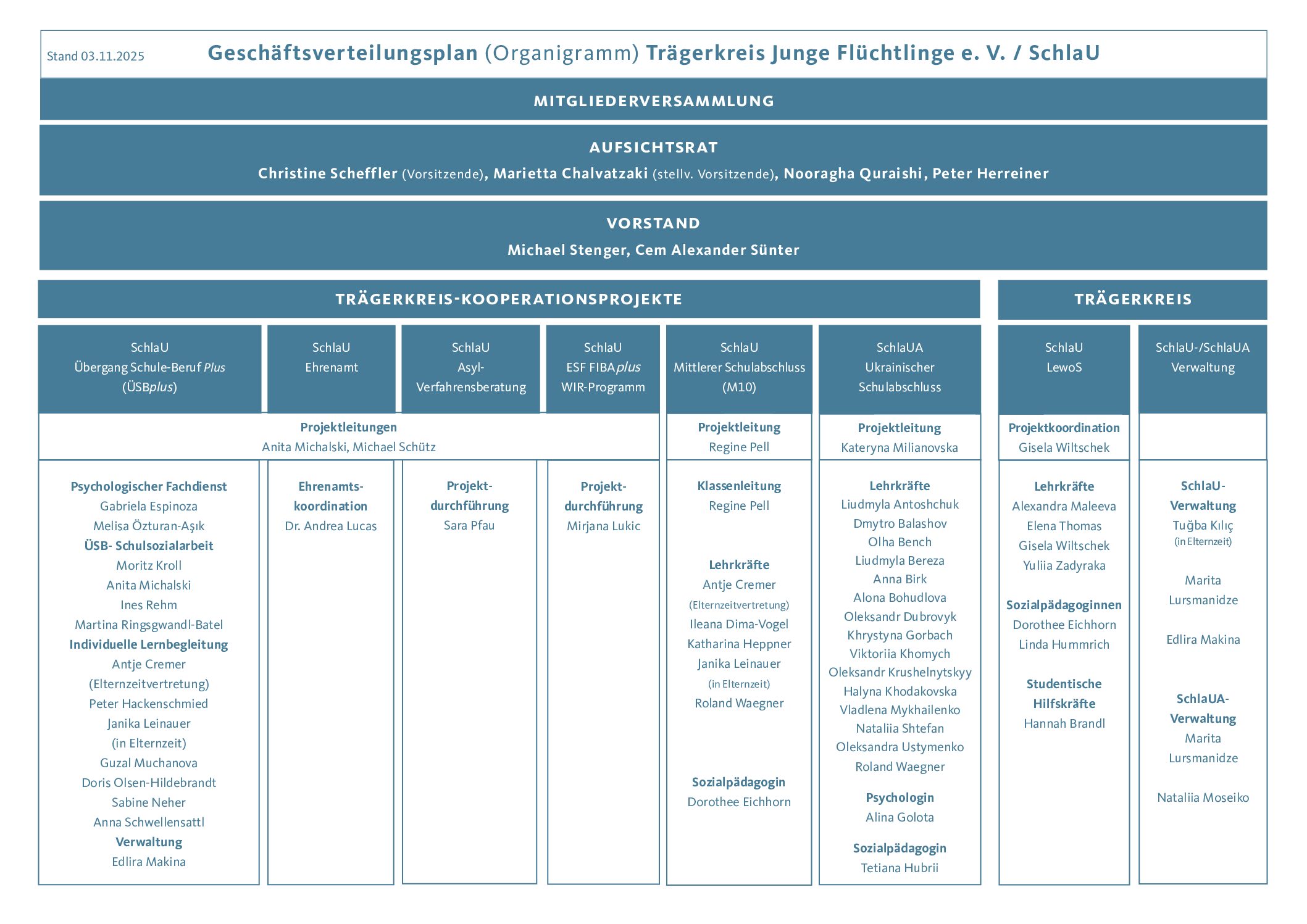 Der Trägerkreis junge Flüchtlinge e. V. besteht seit dem Jahr 2000. Sein Vereinszweck ist, sich für die Bildung von Flüchtlingskindern und -jugendlichen einzusetzen, die in vorhandene öffentliche Bildungsangebote nicht oder nur nachrangig integriert oder vermittelt werden können und durch seine Bildungsaktivitäten perspektivisch die Zukunftschancen dieser Zielgruppe zu unterstützen. SchlaU ist eine soziale Bildungseinrichtung und damit die operative Ebene des Trägerkreis. Dort werden junge Geflüchtete von der Alphabetisierung bis in die Arbeitswelt begleitet und unterstützt.